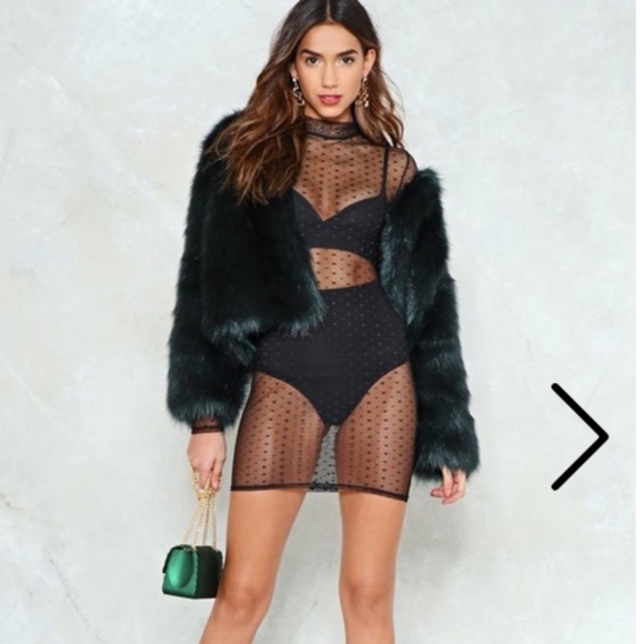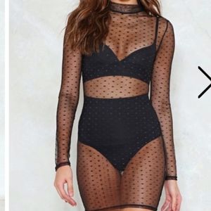 A 9pm to 9am kind of dress. The Mesh From the Party Dress comes in sheer mesh and features a high-neckline, fitted silhouette, polka dot design, and button closure at back.