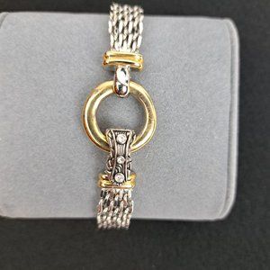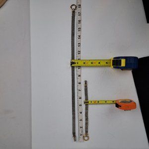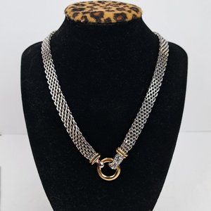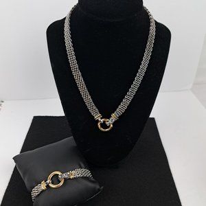 Mesh Chain Necklace & Bracelet Set with Donut Pendant. Silver & Gold Tone. Buckle clasps on both pieces. The hook that goes through the buckle is magnetic to secure it. A very pretty modern contemporary jewelry set. Great for casual, dressy, career wear. Preowned with some light surface wear. Please see pictures. Please see pictures for approximate measurements. No Branding.