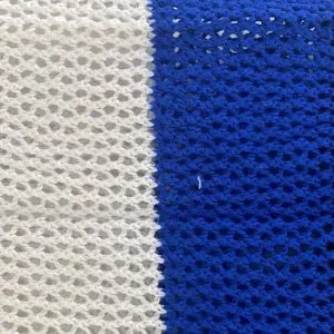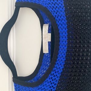 Royal blue, white and black striped mesh sweater. Scoop neck, measures 22” from shoulder to bottom. Rayon, machine washable. Perfect for spring and cool summer evenings. Great for travel.