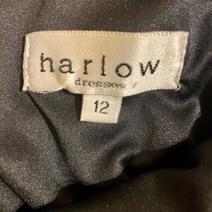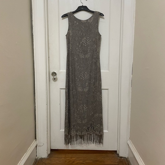 Mesh full length dress in tan over black lining and fringes adorning the bottom. Scoop neck in front and v neck in back. Dress is size 12 by Harlow Dresses. In excellent condition.