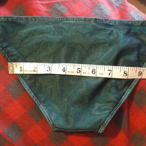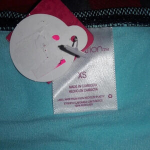 Brand new with tags Xhilaration brand bikini bottoms, size XS. Has a medium blue/teal color bottom with a black mesh fishnet overlay and 2 solid black straps on each side. Laying flat, unstretched waist is approximately 12 inches, stretches up to approximately 15 inches. All items are from a pet free, smoke free home and will ship same or next day.
