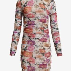 Mesh Floral Long Sleeve Ruched Mini Dress