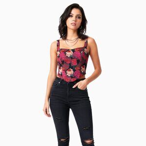 This romantic floral mesh corset crop top in black sheer mesh features a dramatic pattern of red and hot pink roses. The supportive boned structure ensures a figure-flattering fit. With its chic sweetheart neckline and stretchy fabric blend top perfectly captures the nostalgic, romantic edge of Y2K and coquette style. This bustier is ideal for layering or wearing on its own.