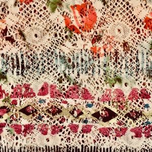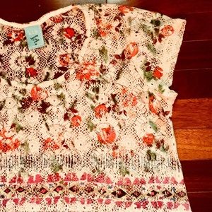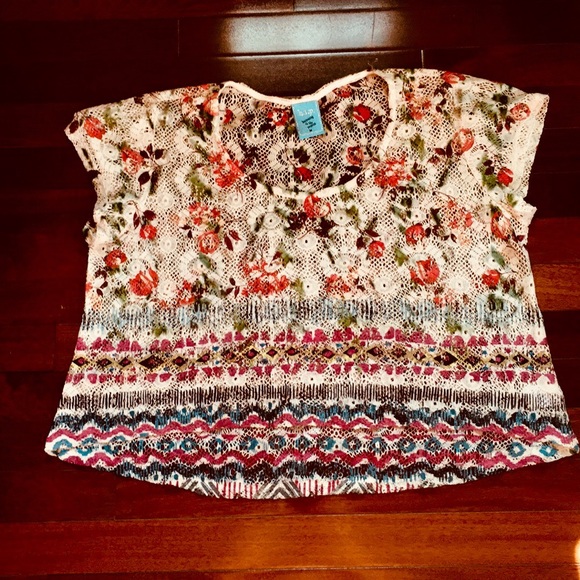 Mesh hi-lo top with floral print and pattern bottom border. Fits loose, great to wear over a bathing suit on the beach or over a cami in the summer time. Comfortable and casual, excellent condition.