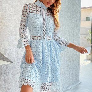 Mesh Insert Mock Neck Flounce Sleeve Lace Dress Blue