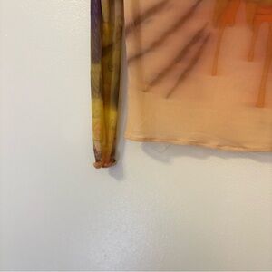 This fitted long sleeve blouse from Source Unknown features a captivating blend of orange and yellow hues, creating a vibrant and artistic look. The top's form-fitting design and unique color pattern make it a standout piece for any wardrobe.