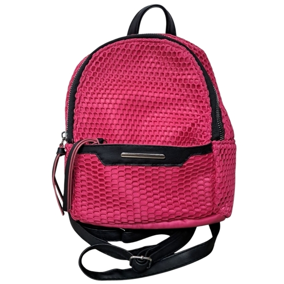 This vibrant pink backpack features a unique mesh texture and contrasting soft black leather straps, making it a stylish choice for everyday adventures. Its medium size offers ample space for essentials while maintaining a sleek profile.