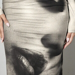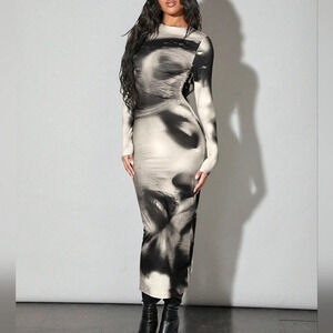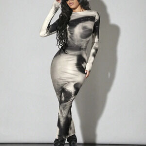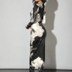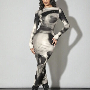 Mesh Printed Long Sleeve Slim Fit Long Bodycon Dress