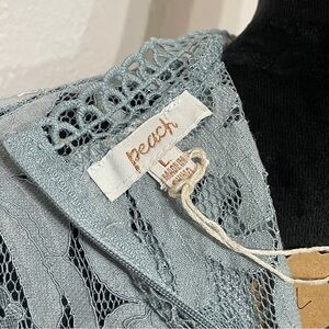A gorgeous, unique blouse from Peach with a romantic, ethereal vibe! This top features a lace-up front (sometimes called a corset style front) and beautiful puffed mesh sleeves that add volume and detail. The light blue color and structure give it a lovely, Greek or cottagecore aesthetic. Perfect for a casual date, brunch, or pairing with white jeans.