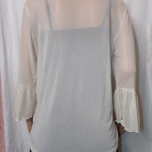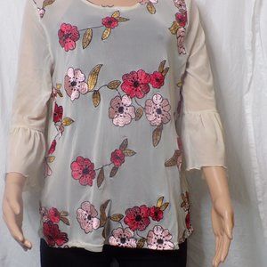 Mesh blouse with floral prints on the front. (L) Gently worn and in good condition.