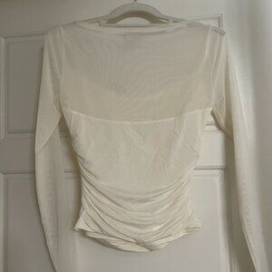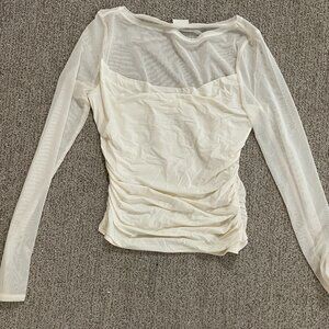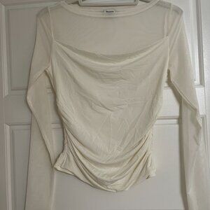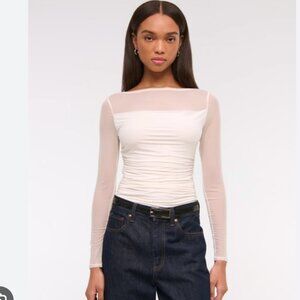 Slim-fitting long-sleeve top in our soft light drape fabric, with a mesh overlay, on-trend slash neckline and draping details along the bodice. Imported.