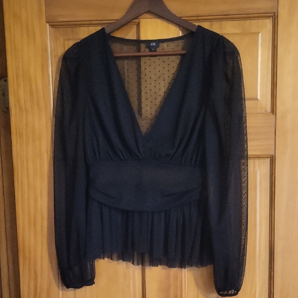 V-neck wrap top with dots and mesh. Black color, tag says 10 but fits small 2/4.