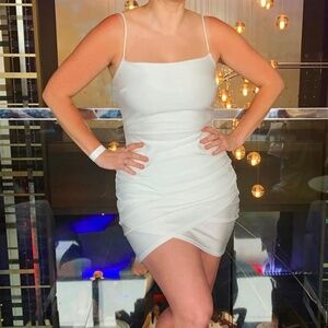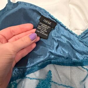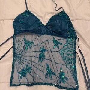 Top ties in back and around neck. Cute mesh with embroidery sequins