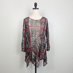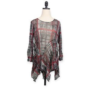 Whimsigoth plaid mesh long sleeve top from Comfy US, size small. Vintage Y2K. Sheer mesh, handkerchief hem, flowy fit. Ideal for 90s, Y2K, punk, fairy goth, and cyber vibes. Perfect for layering, spring, fall, summer, and winter.