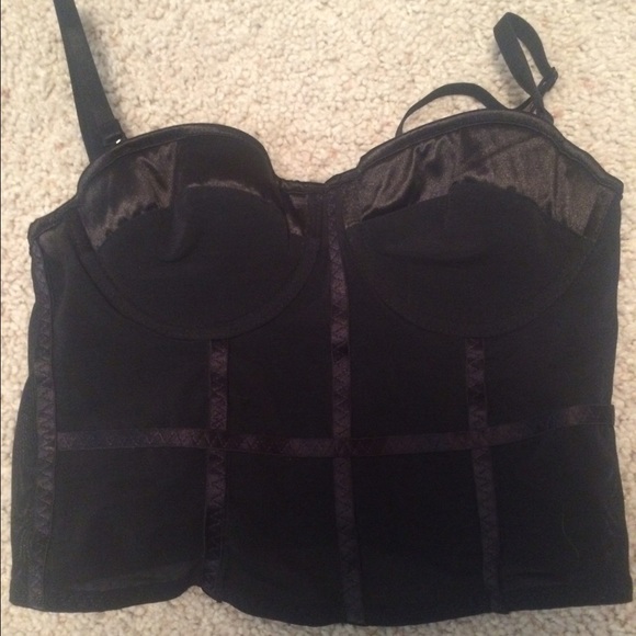 Mesh and satin bustier with underwire. There is extra fabric in the cups so they aren't see through but there is no extra padding. Adjustable and removable straps with hook and eye closures in the back. Great condition with no holes or stains.