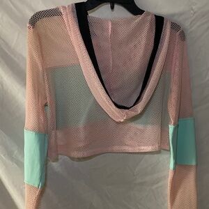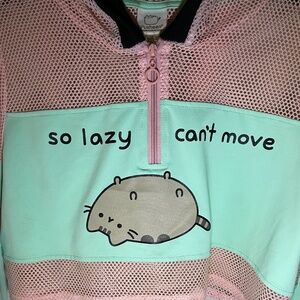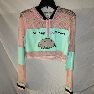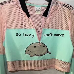 Pusheen mostly mesh crop top. Half zip, has hood. Light pink and mint green