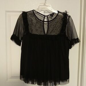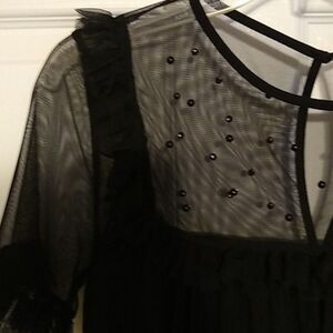 Mesh, with black beads on front and back, sheer top portion and sleeves.