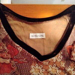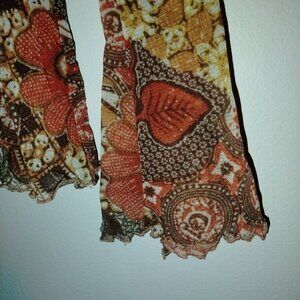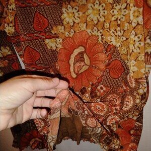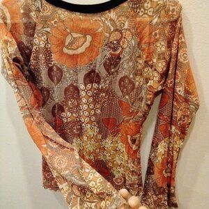 This is a really nice quality velvet collared, mesh, floral printed, long sleeve shirt. It has a tan mesh inside layer. There is no size labeled but I'd say it fits like a small. The orange, yellow and brown tones and fun patterns really made me fall in love with this unique top.