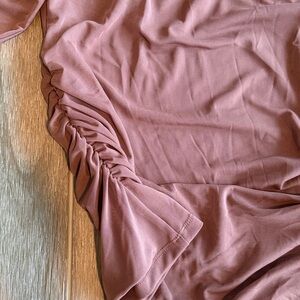 Slinky mesh unlined pullover, off-shoulder cowl. Light as a feather. Ruched sides. Floppy and graceful. This shade of brown goes with black, white, grey, jeans, khaki, red…