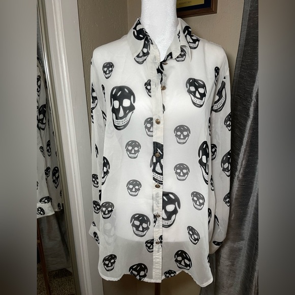 Beautiful white button down with skulls. Silver buttons. A little longer length in the back.
