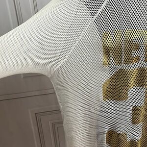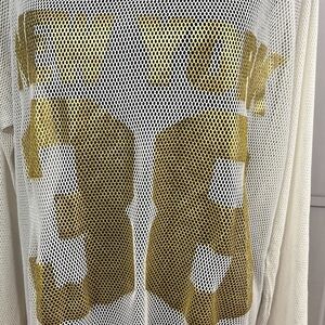 Blush brand size 2 XL off-white gold and black mesh top see-through mesh gold New York 32 on the front jersey style said black and white striped collar and cuffs good preowned condition please see pictures