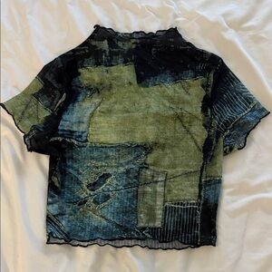 Unique artistic patchwork top with a blend of green and blue tones. Perfect for a bold fashion statement.