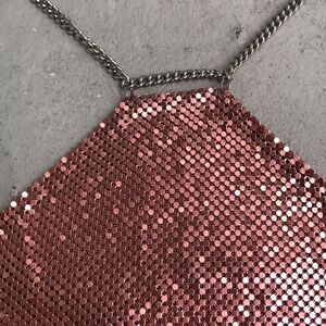 Super cute metal mesh halter top.That is in very good condition. Measuring across the bottom. Only the mesh is 24 inches measuring with the length of the chain to secure it is 42 inches, through the center is 10.5 inches the second row of chains measure.