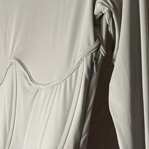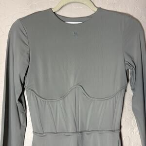 Meshki Astrid long sleeve corset body con mini dress in sage green. Lots of stretch. approximate measurements