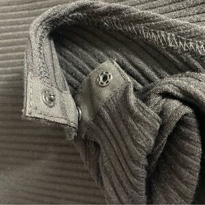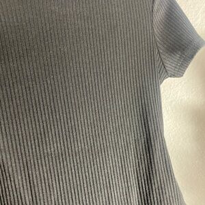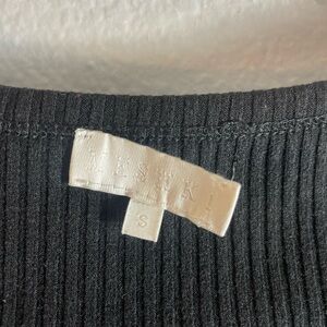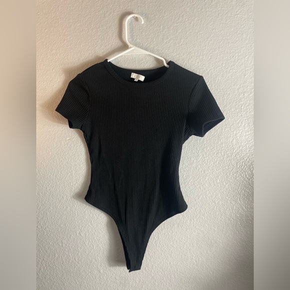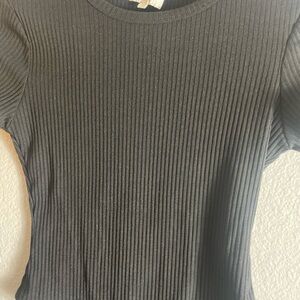 Sleek black ribbed bodysuit. Short sleeves. Perfect for layering. Used, see pictures *label tag is detaching*