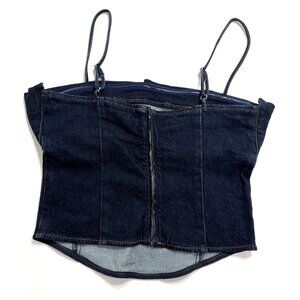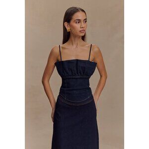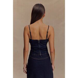 Description from retailer: The CECILIA Denim Frill Corset brings a feminine twist to structured styling. Designed with a flattering fitted silhouette, this corset features a delicate ruffle neckline, round hem shape, and adjustable straps for a custom fit. A back zip closure ensures easy wear, while the denim fabrication adds a touch of edge to its romantic detailing.