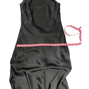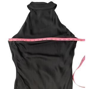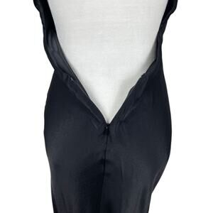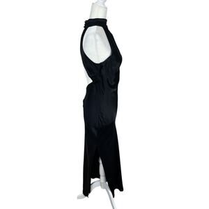 Black satin high neck maxi dress. Open back, three button collar, back zip with hook-and-eye, side slit. Lined to side slit. Black. Size XS. Please see photos for measurements.