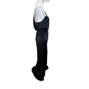 The Meshki Clementine maxi dress stuns in sleek black satin with an asymmetric neckline, chain strap detail, and side cutout—designed for unforgettable formal evenings.