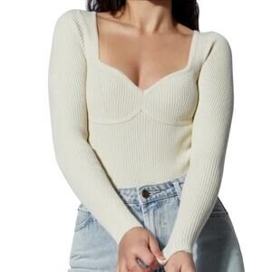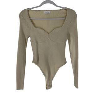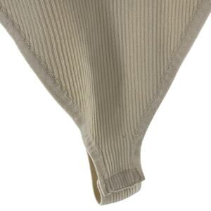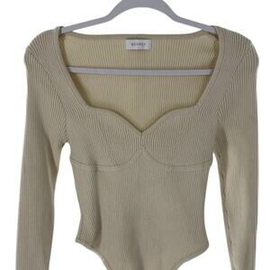Meshki cream ribbed Rinna knit corset style bodysuit. Scoop neck. Long sleeves. Thong back. Button gusset closure. Recycled polyester, polyamide, viscose. Machine wash. TP04541KD7. In preowned condition.