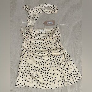 Stylish cream dress with black polka dots. Features a trendy shoulder tie.