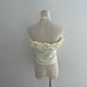 This Meshki off-shoulder ruffle top is romantic, soft, and super flattering. Features layers of sculpted ruffles that frame the neckline perfectly, plus a halter strap for an elegant fit. Effortless to dress up or down , from brunch to date night.