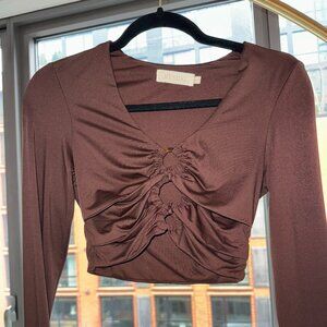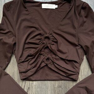 Meshki - Long Sleeve Chocolate Brown Ring Cut Out Crop Top - Small