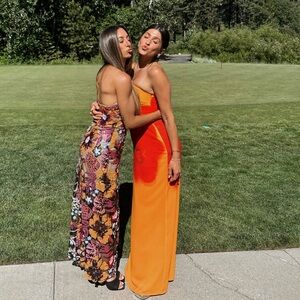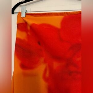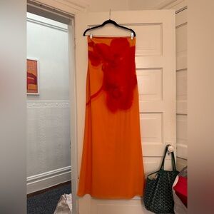 Vibrant orange dress with red flower accents. Perfect for adding a pop of color to your wardrobe.