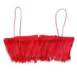 Vibrant red skirt set with fringe details. Strapless top and matching skirt. Perfect for a bold look.