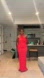 Elegant red maxi dress. Featuring a unique twisted halter neckline with an attached scarf detail. The front and back wripple paneling sculpt the body, complemented by a fishtail shape and softly rippled hem for a fluid finish. Unlined for a lightweight feel, perfect for special occasions.