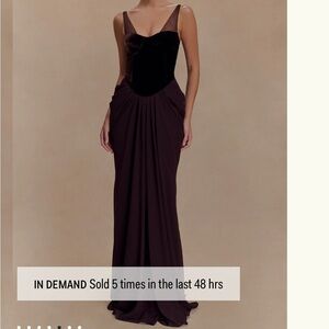 Chic dark brown/plum dress with a fitted bodice. Features elegant draping and a velvet corset body. Perfect for formal events.