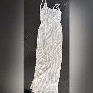 Elegant white ribbed maxi dress. Sleeveless design. Perfect for any occasion.