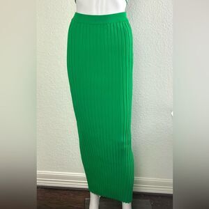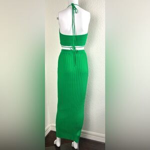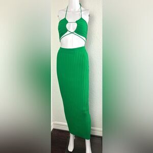 Vibrant green ribbed set with a strappy design. Ideal for a bold statement. Like new condition Meshki Crystal ribbed maxi set. The knit halter top will leave and everlasting impression with its cross-over halter neckline and waist tie feature. Pair with our Crystal ribbed maxi skirt. Stretchy fabric and length of skirt is 39.5".