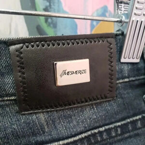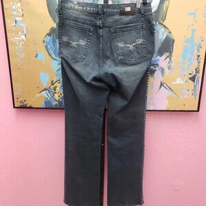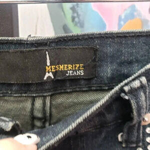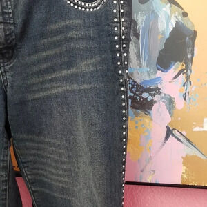 These vintage jeans are blinged out. Rhinestones down the sides and on back pockets, fabric does have shading and distressing.