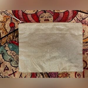 Lined with lavender satin, finished with a metallic sheen and zip closure. Use it as a makeup bag, mini clutch, or vessel for your chaotic divinity.