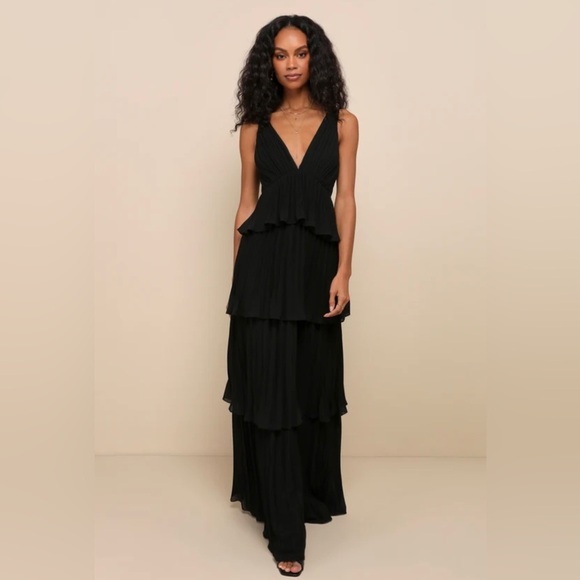 Lulus black v-neck pleated flutter tiered gown with plunging back and back tie. Floor length maxi dress cinches in at the waist. The perfect blend of classic and ethereal for your next formal event, prom, black tie affair, ball or wedding.