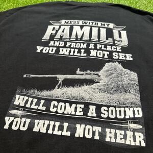 Make a bold statement with this *"Mess With My Family" Sniper Graphic Tee.* Featuring a detailed image of a sniper and the powerful message: "Mess with my family and from a place you will not see, will come a sound you will not hear," this tee is perfect for those who love graphic tees with a strong, patriotic vibe. The classic black color and striking white print make it an easy match for any casual outfit.