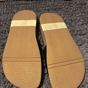 Comfortable black slide sandals with a sleek design. made in Portugal and so comfy, they hug your feet, no clip clopping like some slide sandals. These are NWOT and priced low because my puppy took a bite on the heel. See pics for condition. I didn’t do any work on them but I’m sure you could shave them down and seal with cork sealer if it bothers you. Price reflects that.