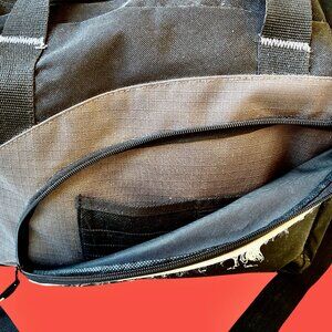Black messenger bag for laptop and books with white horse art on the front pocket. Top zipper closure. Dual handles and attached adjustable shoulder strap. Front large pocket with mesh pockets for credit cards and a zipper mesh pocket. One side mesh water bottle pocket. Interior has a padded flap/compartment with a hook & loop closure. Ring on the front to clip items on. Window on the back for ID.