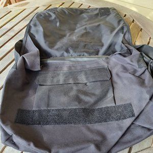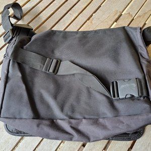 LA design on black canvas messenger bag. Shoulder strap and cross body strap on back. Velcro closure. 2large pockets inside 1 pocket under front flap with velcro closure. 80% polyester 20% polyvinyl 17 1/2"× 15x 4