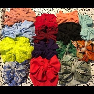 Handmade messy bows in a variety of colors and styles. Can be tied as a wrap or put on nylon headbands (your choice). Standard size is 10-12in circumference before stretching but some fabrics are stretchier than others, so can also be made to your specifications. Message me and I’ll create a custom bundle just for you. $7 each then $4 for each additional. Handmade so may have minor imperfections typical of a handmade item.